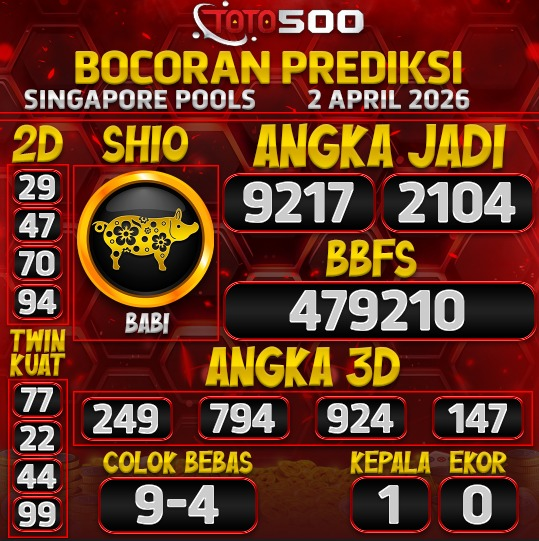Kunjungi TOTO500 setiap hari untuk mendapatkan prediksi Singapore, Sydney, Japan, Hongkong, dan China Pools paling akurat dan terupdate.