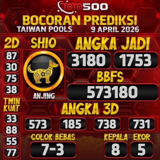 Prediksi ini bersifat sebagai referensi tambahan. Togel tetaplah permainan peluang. Tidak ada metode yang menjamin kemenangan mutlak. Bermainlah secara bijak dan sadar risiko. Demikian prediksi angka togel Taiwan Pools hari ini dari TOTO500. Tim kami akan terus menghadirkan update harian dengan akurasi dan analisa terbaik untuk Anda.